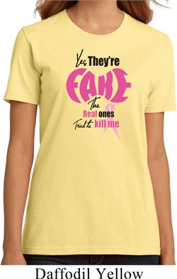 CompareLadies Breast Cancer Shirt Yes, They’re Fake Organic Tee T-Shirt 100% cotton Available in Ladies Small, Ladies Medium, Ladies Large, Ladies XL, Ladies 2XL & Ladies 3XL Also available in colors Charcoal, Daffodil Yellow, Light Blue, Lime, Medium Grey, Natural, Red, Royal, and White