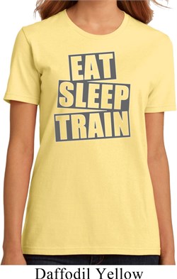 Ladies fitness Shirt Eat Sleep Train Organic Tee T-Shirt 100% cotton Available in Ladies Small, Ladies Medium, Ladies Large, Ladies XL, Ladies 2XL & Ladies 3XL Also available in colors Black, Charcoal, Daffodil Yellow, Light Blue, Lime, Medium Grey, Natural, Navy, Red, Royal, and White