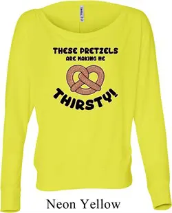 CompareLadies Funny Shirt Thirsty Pretzels Off Shoulder Tee T-Shirt A poly/viscose blend These pretzels are making me thirsty Marbles are a cotton/poly blend Available in Ladies Small, Ladies Medium, Ladies Large, Ladies XL & Ladies 2XL Also available in colors Athletic Heather, Black, Black Marble, Blue Marble, Dark Grey, Maroon, Midnight, Neon Pink, Neon Yellow, Pebble Brown, Red, White, and White Marble
