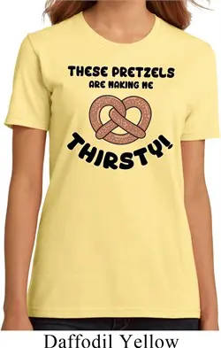 CompareLadies Funny Shirt Thirsty Pretzels Organic Tee T-Shirt 100% cotton These pretzels are making me thirsty Available in Ladies Small, Ladies Medium, Ladies Large, Ladies XL, Ladies 2XL & Ladies 3XL Also available in colors Black, Charcoal, Daffodil Yellow, Light Blue, Lime, Medium Grey, Natural, Navy, Red, Royal, and White