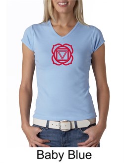 This Ladies Yoga T-shirt Muladhara Root Chakra V-neck Tee Shirt features a spectacular image of Muladhara Chakra one of seven primary charkas in Hindu tantrism represented by color red considered ‘root’ or ‘foundation’ chakra at spine base transcendental basis of physical nature and seat of kundalini awakeninggreat spiritual potential which begins ascent here ultimately uniting female and masculine energies of Shakti and Shiva. Our t shirt beautifully captures “Muladhara Chakra” while its 100% combed ringspun cotton, super soft 1×1 baby rib knit, sideseamed, set-in cap sleeves, classic fit and traditional V-neck exudes sheer femininity, comfort and style making a superb choice for every woman in classic color choices complementing every wear. Available in Ladies Small, Ladies Medium, Ladies Large, Ladies XL & Ladies 2XL View our complete line of Yoga Clothing