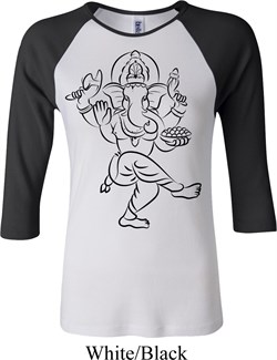 CompareA ladies 3/4 sleeve shirt with color block sleeves featuring a funny sketch of the wise Ganesha. Our ladies tee is made of 100% cotton. (Deep Heather Black is made with a blend of cotton/poly) Available in sizes Small through 2XL. Machine wash cold with like colors; dry low heat.