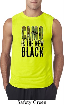 CompareMens Funny Shirt Camo is the New Black Sleeveless Tee T-Shirt 100% polyester Athletic heather is a cotton/poly blend Available in Small, Medium, Large, XL & 2XL Also available in colors Black, Carolina Blue, Charcoal, Navy, Red, Royal, Safety Green, and White