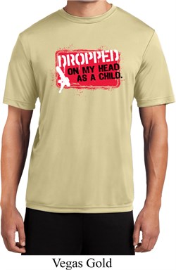 CompareMens Funny Shirt Dropped On My Head Moisture Wicking Tee T-Shirt 100% polyester Available in Small, Medium, Large, XL, 2XL, 3XL & 4XL Also available in colors Black, Cardinal, Carolina Blue, Forest, Gold, Kelly, Light Pink, Lime, Maroon, Navy, Purple, Royal, Sand, Silver, Tropic Blue, Vegas Gold, and White