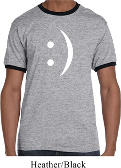 CompareMens Funny Shirt Smiley Chat Face Ringer Tee T-Shirt 100% cotton Heather/black is a cotton/poly blend Available in Small, Medium, Large, XL & 2XL Also available in colors Carolina Blue/Navy and Heather/Black