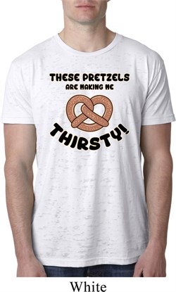 CompareMens Funny Shirt Thirsty Pretzels Burnout Tee T-Shirt A cotton/poly blend These pretzels are making me thirsty Available in Small, Medium, Large, XL & 2XL Also available in colors Black, Dark Grey, and White