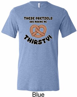 CompareMens Funny Shirt Thirsty Pretzels Tri Blend Crewneck Tee T-Shirt A cotton/poly/rayon blend These pretzels are making me thirsty Available in Small, Medium, Large, XL & 2XL Also available in colors Aqua, Athletic Grey, Berry, Blue, Brown, Charcoal Black, Clay, Emerald, Green, Grey, Maroon, Navy, Oatmeal, Orange, Purple, Red, Solid Black, Teal, Royal, and White